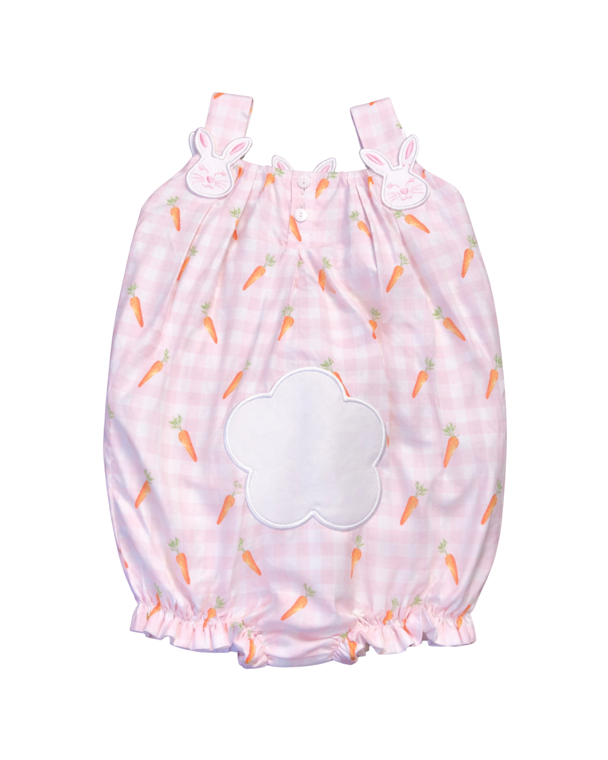A sweet pink gingham bubble with scattered carrots and the cutest appliqué bunnies across the chest, each finished with a 3D ribbon bow. Made from 100% cotton with soft gathers and a comfy fit.