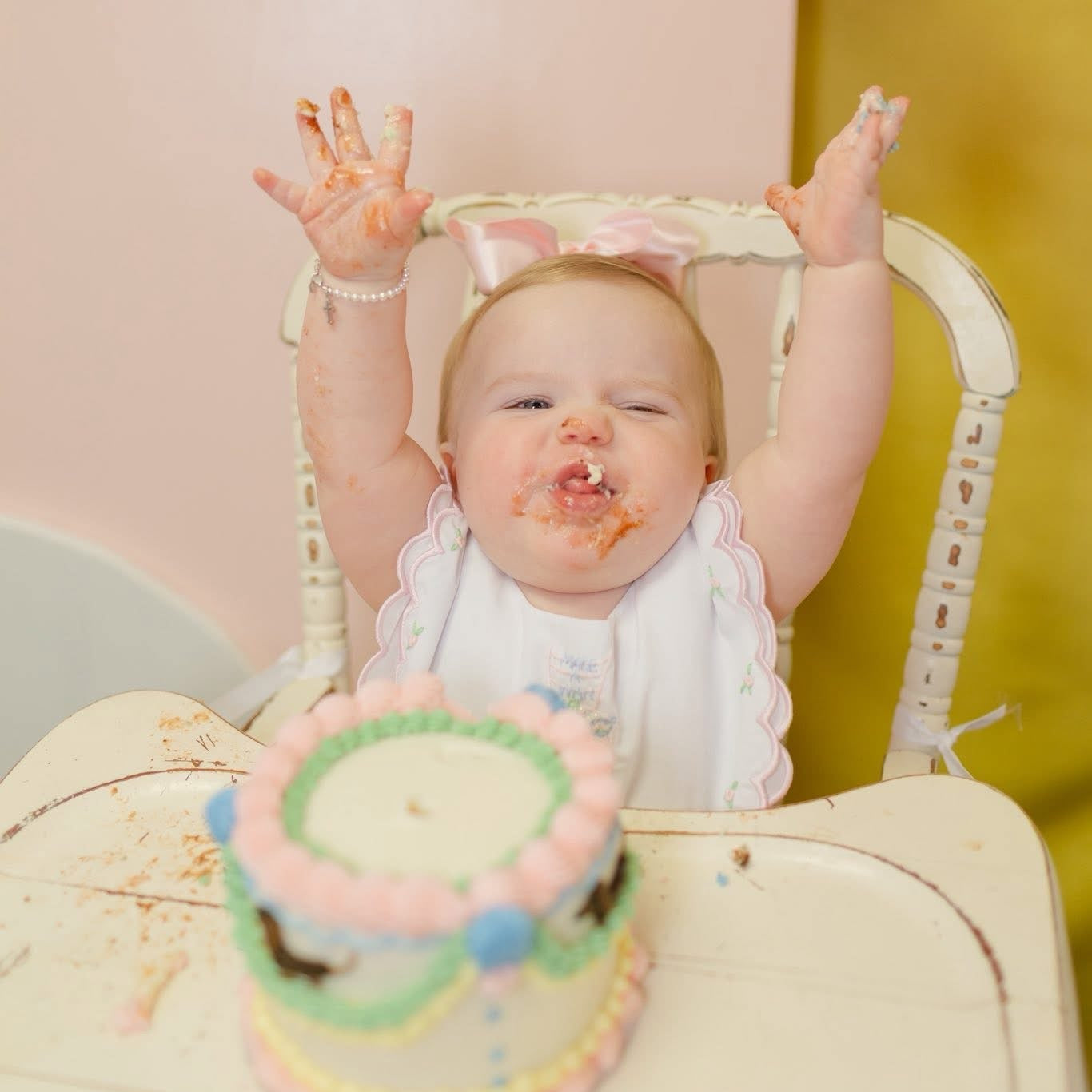 This heirloom bib is designed with hand-embroidered rosettes along the scalloped collar and delicate pearl sprinkle details across the cake. Comes without personalization. The sweetest bib for enjoying that first birthday cake — and a keepsake to treasure long after the candles are blown out.