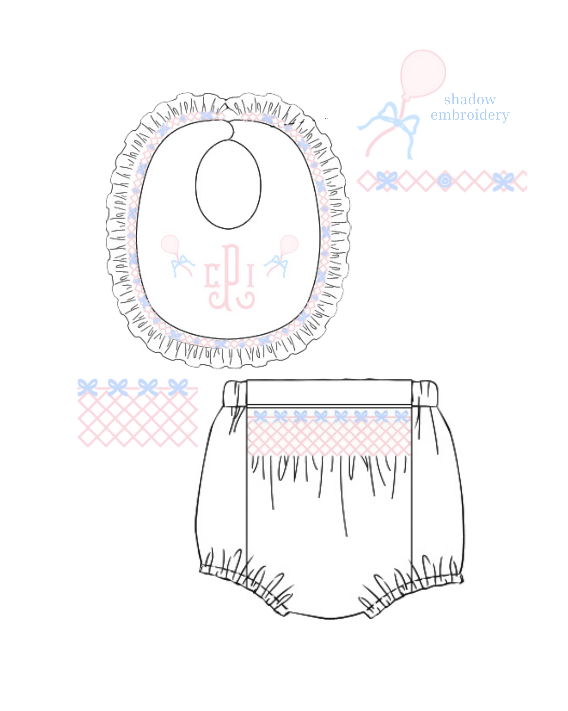 This precious set features a hand-smocked bow border on the bib with matching bloomers in the sweetest baby blue and pink color combination. The bib is finished with shadow-embroidered balloons for a celebratory touch. Comes without monogram. Perfect for smashing the first birthday cake and capturing those milestone photos.