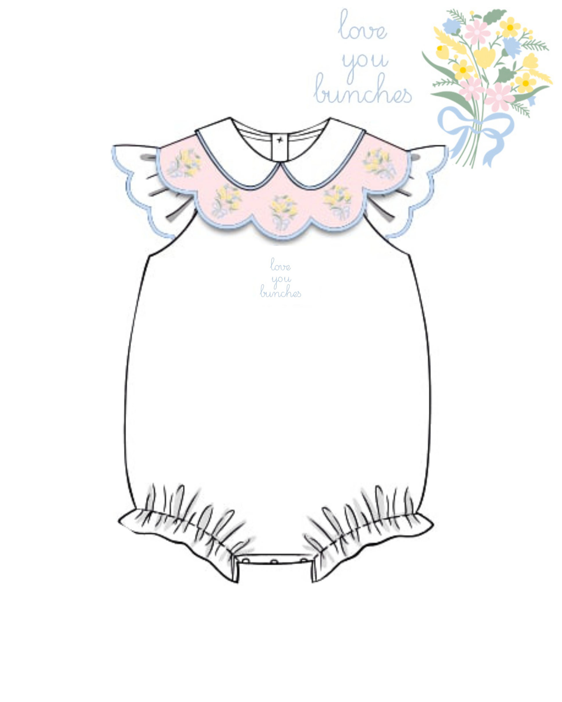 A sweet bubble with a scalloped floral collar, delicate embroidery reading “love you bunches,” and ruffle leg openings. The soft details make it a perfect choice for spring days, family photos, or gifting.