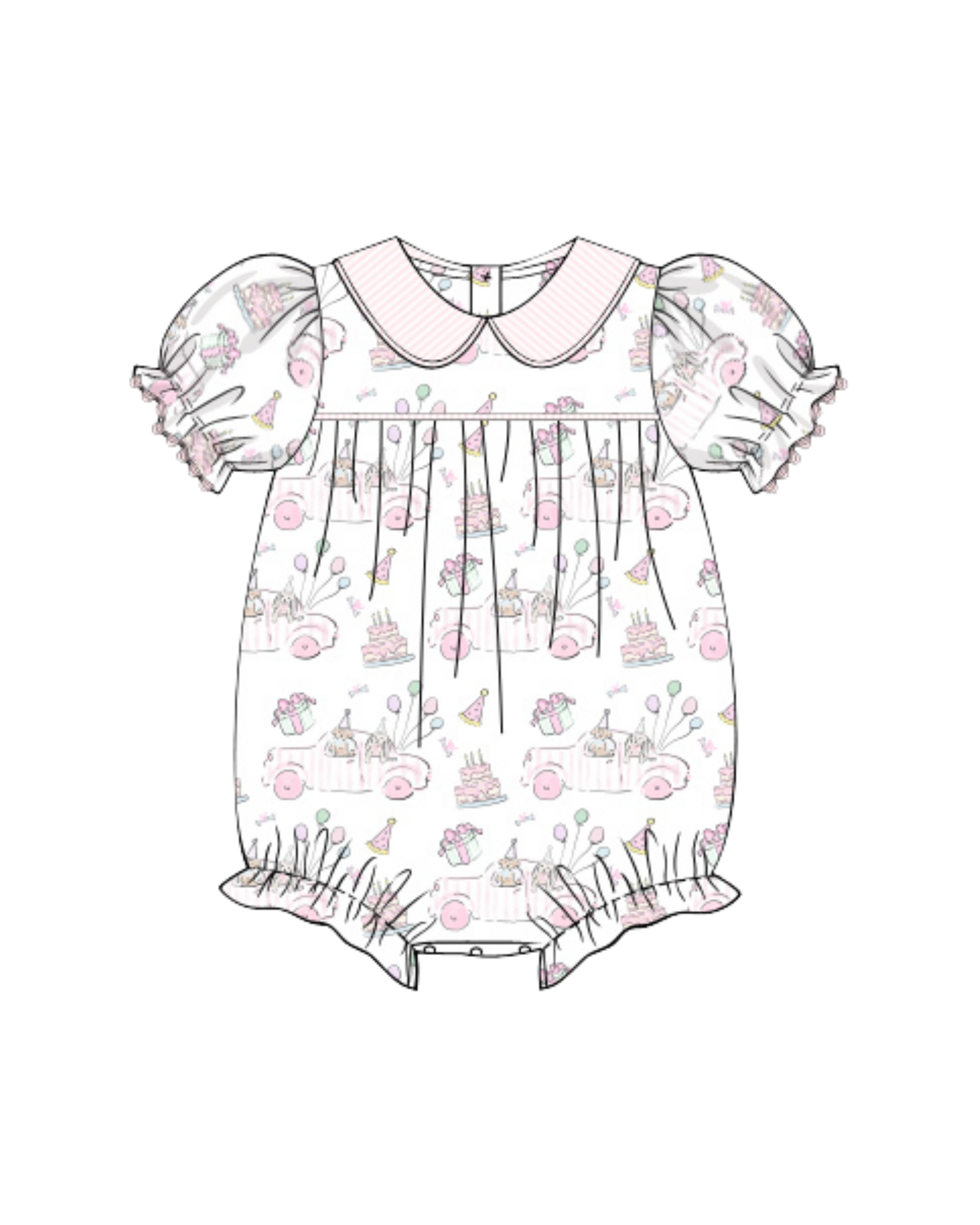 It's pawty time! This knit style is soft, comfy, and easy to wear. Finished with a Peter Pan collar, puff sleeves, and ruffle leg openings, it’s the sweetest everyday bubble with a celebration twist.