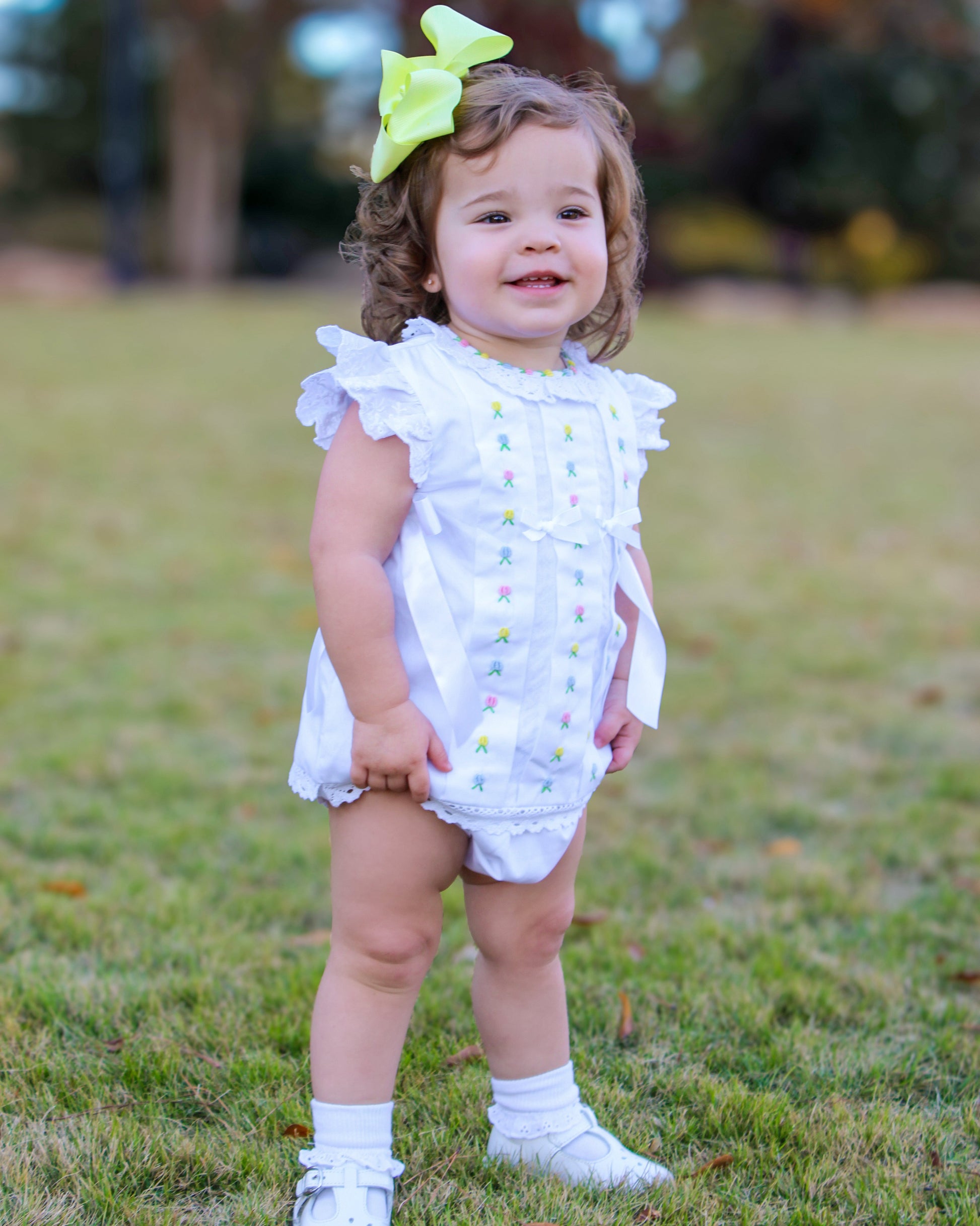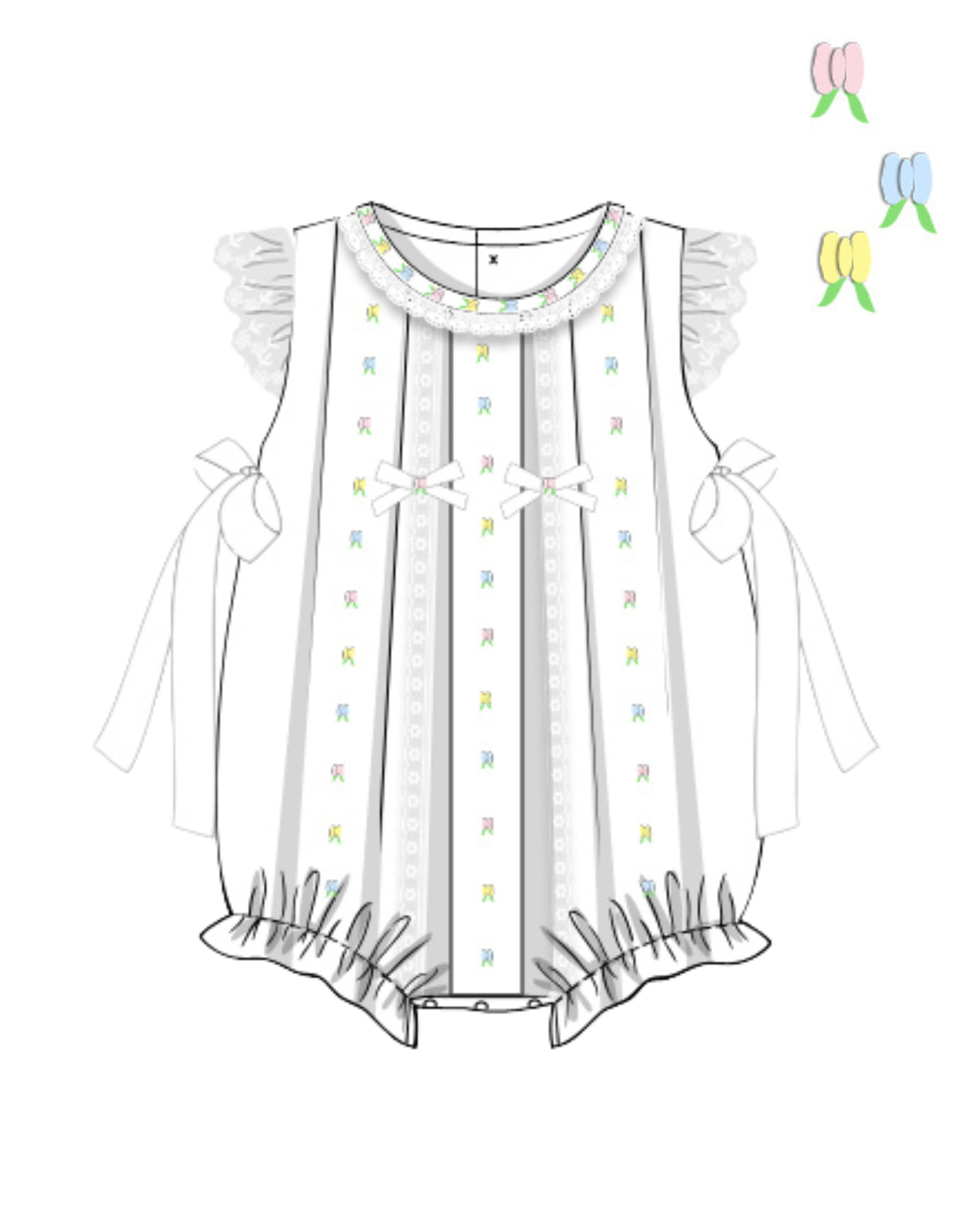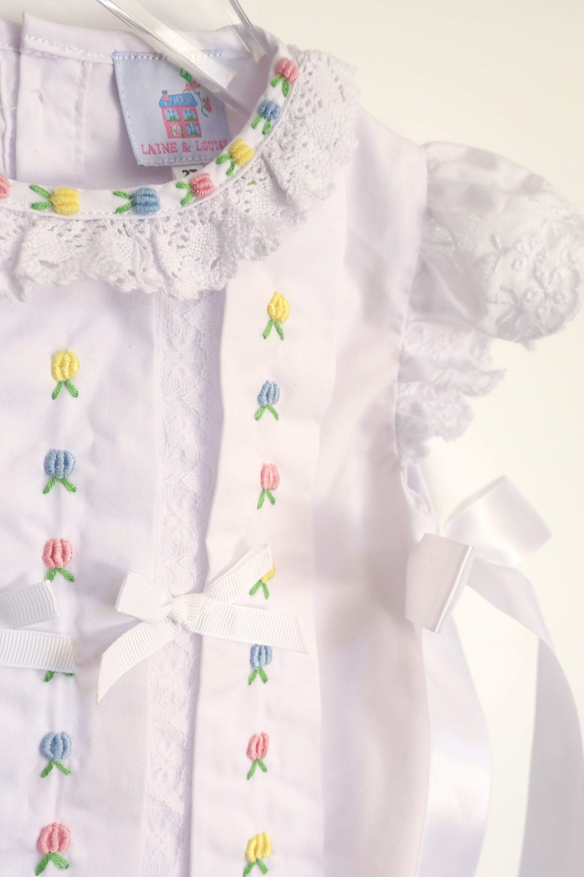 A classic white bubble in 100% cotton with hand-embroidered tulips down the front, finished with delicate lace trim and sweet ribbon bows. Soft, feminine, and perfect for spring occasions.